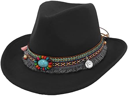 haozaikeji Unisex Fedora Cowboy Hat with Turquoise Fringed Belt Vintage Wide Brim Panama Hats Faux Felt Western Cowgirl Hats Fancy Dress Accessory for Travel Dating Costume Cosplay Party