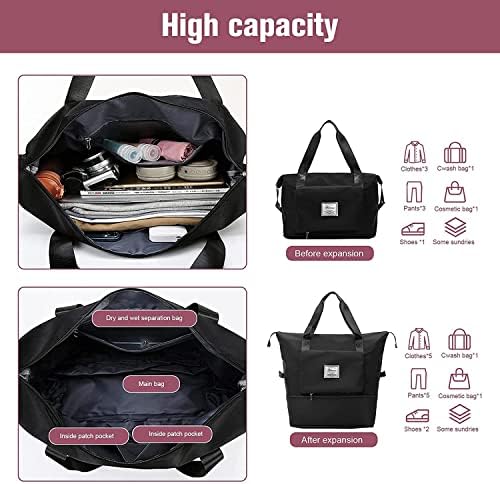 Large Capacity Folding Travel Bag, Travel Lightweight Waterproof Carry on Luggage Bags with Fixed Strap, Dry and Wet Separation Foldable Travel Duffel Bag for Weekender Overnight Sports Gym (Black)