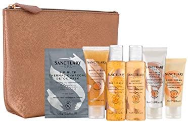 Sanctuary Spa Gift Set, Tempting Travel Treats With Body Wash, Bubble Bath, In-Shower Moisturiser, Body Scrub, Hand Cream, Face Mask and Cosmetic Wash Bag, Gifts For Women, Gift For Her, Vegan