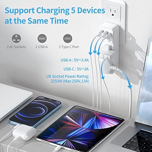 5-in-1 Plug Adapter: Plug Extension powers up to 5 devices simultaneously, just plug into any wall outlet to charge your phones, tablets, digital cameras and other gadgets. Cordless plug extension ( 2 sockets, 3 USB ports ) can solve the trouble caused by the lack of sockets in office, bedroom, hotel and other place. Please note UK to US plug adapter does not convert voltage. USA travel adapter US plug rating is up to 3250W (250V/13A)