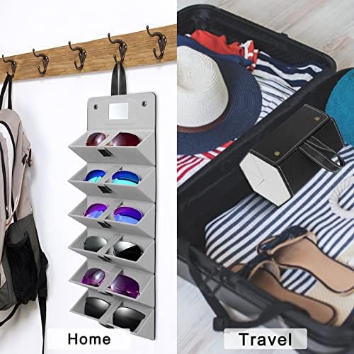 😎[Beautifully crafted]: Simply fold the storage case to keep your eyewear safe during your journey. Then unfold and hang the glasses case for easy access to your collection when you arrive at your destination.The travel sunglasses organizer is upcycled and contains elasticated strap and mirror.